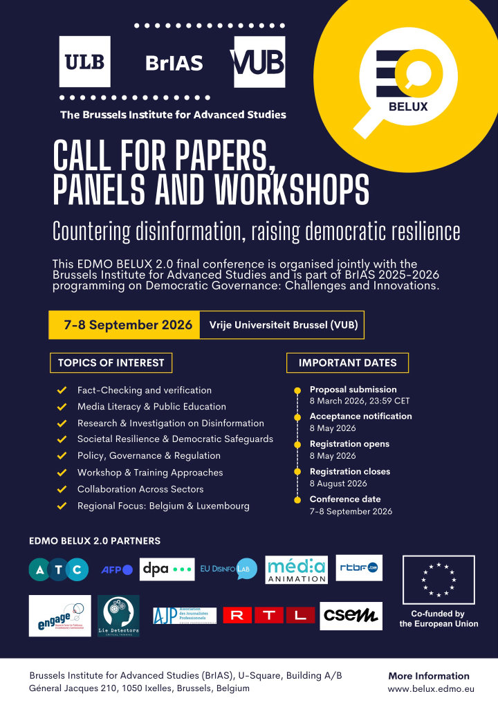 EDMO BELUX 2.0 is a co-financed Digital Europe project, under Grant Agreement number 101158785. This EDMO BELUX 2.0 final conference is organized jointly with the Brussels Institute for Advanced Studies and is part of BrIAS 2025-2026 programming on Democratic Governance: Challenges and Innovations.
