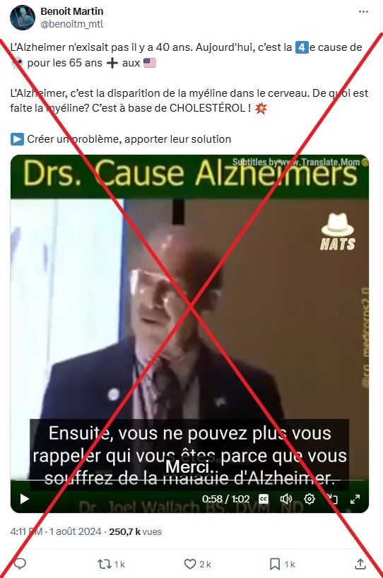 « L’Alzheimer, c’est la disparition de la myéline dans le cerveau. De quoi est faite la myéline? C’est à base de cholestérol !« , avancent des utilisateurs sur les réseaux sociaux (1, 2, 3), relayant depuis plus d’un an une vidéo qui affirme que la maladie d’Alzheimer serait une « maladie causée par les médecins » et provoquée par les médicaments hypocholestérolémiants – prescrits contre l’excès de cholestérol.