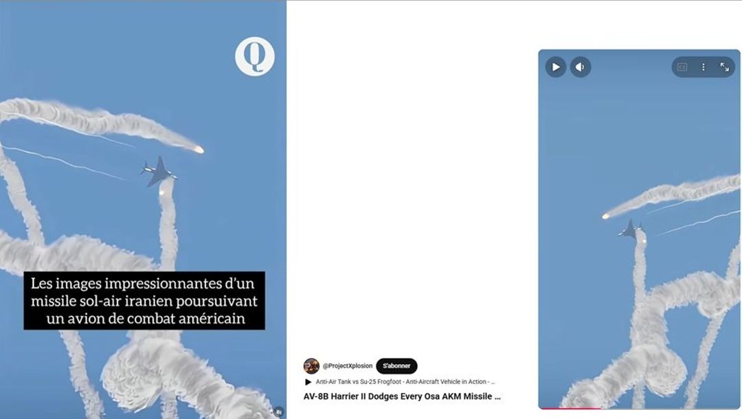 Les images d’un premier short intitulé « AV-8B Harrier II Dodges Every Osa AKM Missile in Action ! », qui veut dire : « L’AV-8B Harrier II esquive tous les missiles Osa AKM en situation de combat ! », en français, ont été inversées horizontalement pour constituer la première partie du « Reel » publié par « lequoti ».