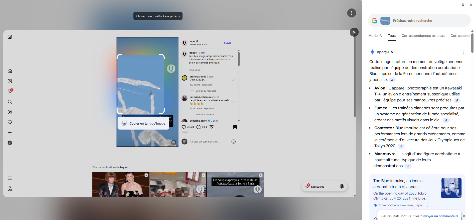 Par exemple, une recherche avec Google Lens directement à partir de la vidéo sur Instagram, nous a indiqué erronément que : « Cette image capture un moment de voltige aérien réalisé par l’équipe de démonstration acrobatique Blue Impulse de la Force aérienne d’autodéfense japonaise » et que l’avion présent sur l’image est un « Kawasaki T-4 ».