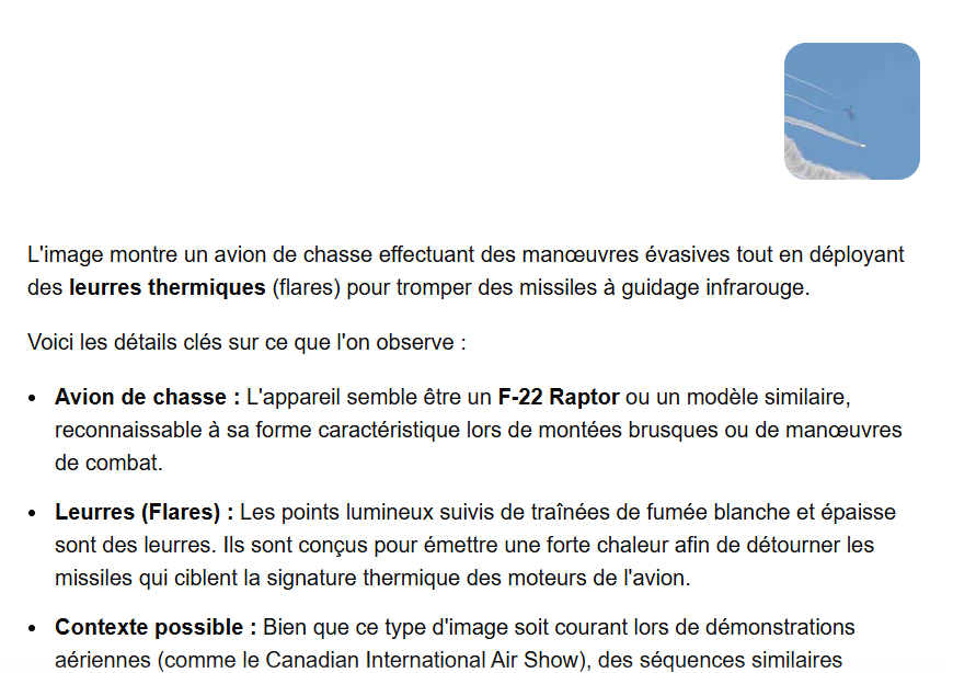 Une autre requête faite sur Gemini, l’IA de Google, pour analyser une autre image capturée de la vidéo Instgram indique erronément que la vidéo « semble être un F-22 Raptor ou un modèle similaire« .