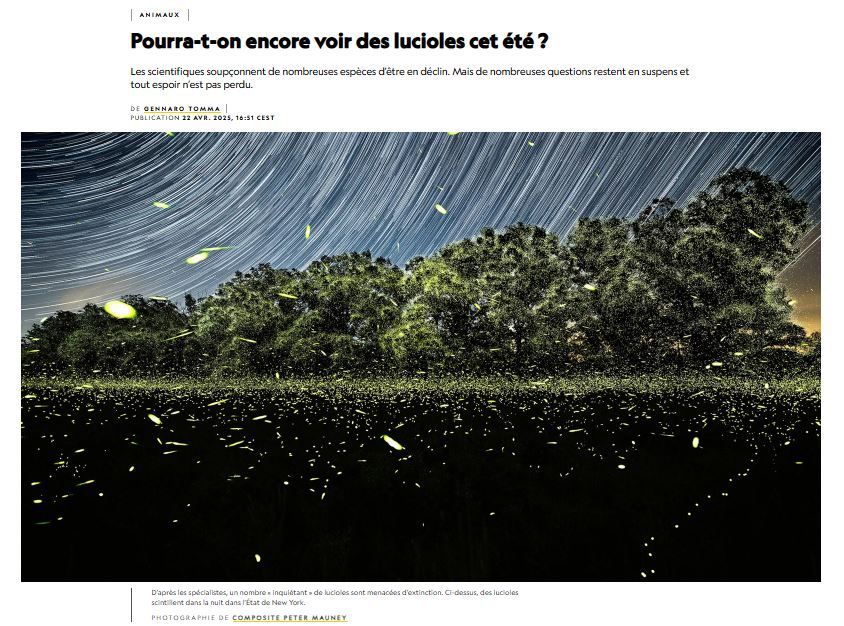 La publication virale en français cite comme source pour ses affirmations le magazine « National Geographic ». Des recherches avancées sur Google avec les mots-clés « lucioles » et « fireflies » sur les sites en anglais et en français du magazine nous ont d’abord renvoyés vers un article, publié en anglais et en français, intitulé « Pourra-t-on encore voir des lucioles cet été ? » publié le 22 avril 2025 (liens archivés ici et ici).