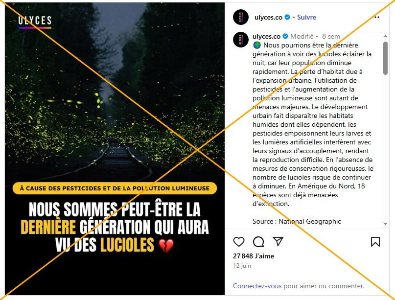 Contrairement à ce qui est évoqué dans les publications sur les réseaux sociaux, l’article du magazine n’indique pas non plus que les lucioles seraient sur le point de disparaître d’ici la fin de cette génération, mais propose des conseils pour faire en sorte de réduire l’impact des activités humaines sur la destruction des habitats de ces coléoptères.