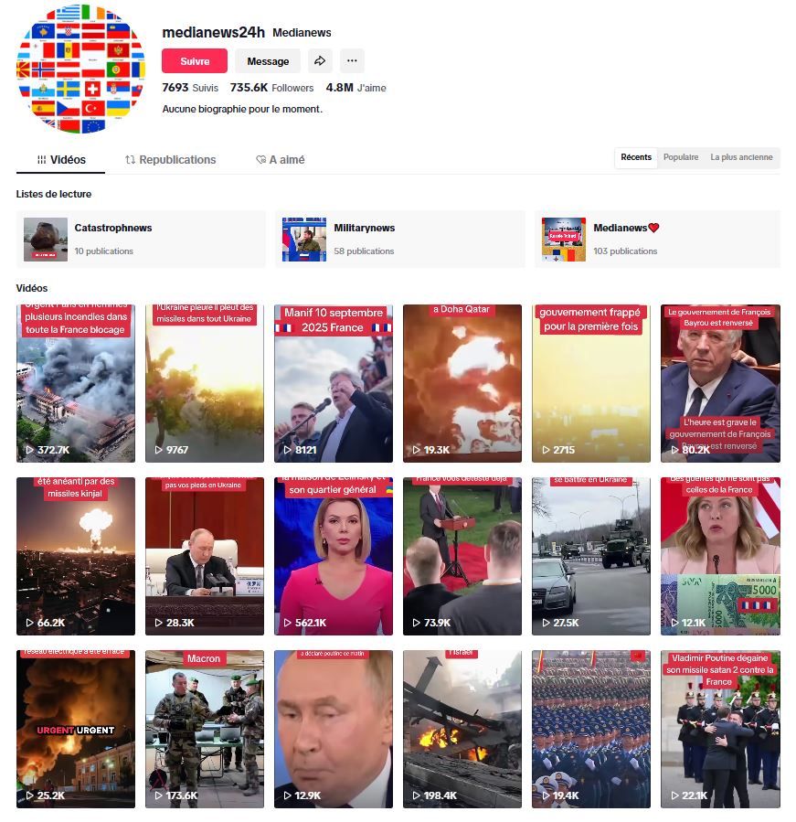 Derrière cette propagation de vidéos portant un même récit par de nombreux utilisateurs différents, on retrouve une quantité de comptes partageant à intervalles réguliers des messages pro-russes. Ces comptes et les contenus qu’ils publient ont souvent des apparences de médias en ligne ou traditionnels, avec des intitulés tels que « Actualités 24« , « Media News 24h« , « actualités.mondiale« , « Infoactu« … et des logos imitant ceux de médias en ligne plus connus.