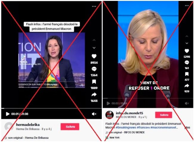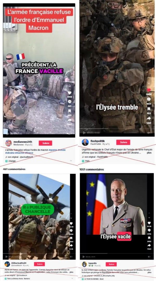 Les différentes vidéos, dont le script revient d’une version à l’autre, portent en substance les mêmes affirmations : « l’armée française« , « l’État-major », « l’armée de terre » ou le chef d’État-major de l’armée de terre, le général Pierre Schill, cité nommément, auraient « désobéi à un ordre direct d’Emmanuel Macron » en refusant d' »envoyer des soldats français combattre la Russie aux côtés des Ukrainiens » en conséquence de quoi un « coup d’État » ou une « crise institutionnelle » seraient imminents (lien archivé).
