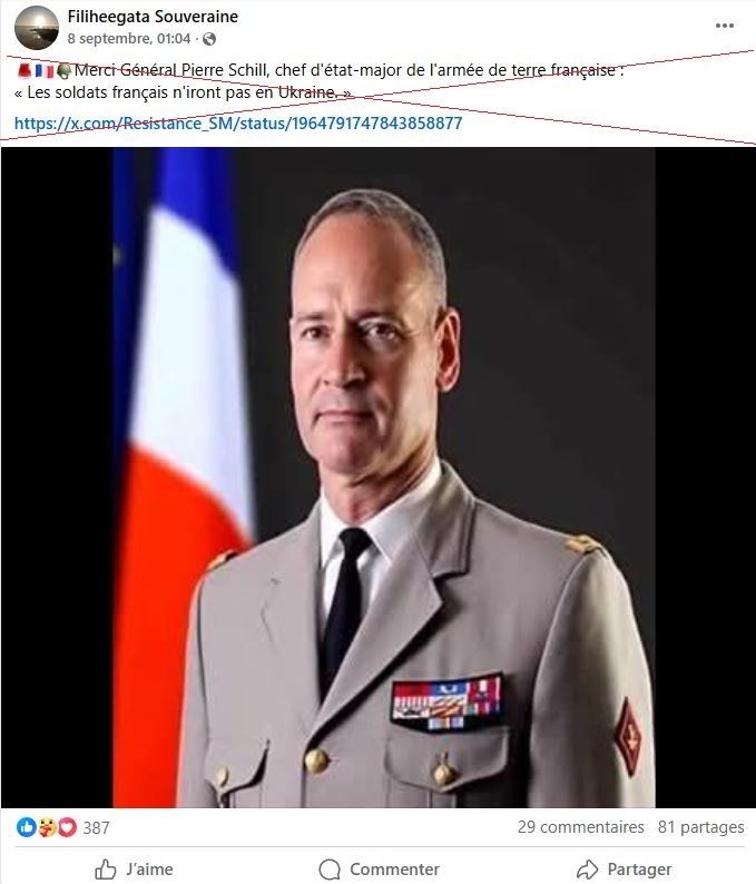 Mais cette affirmation, partagée des milliers de fois sur TikTok (1, 2, 3, 4, 5, 6,) mais aussi Facebook (1, 2, 3, 4, 5), YouTube, (1, 2) X (1, 2, 3, 4, 5) dans plusieurs vidéos reprenant quasiment mot pour mot le même message, est infondée : il n’y a pas eu d’ordre d’envoyer des soldats français combattre en Ukraine contre la Russie et ni le général Pierre Schill, chef d’État-major de l’armée de terre ciblé par les vidéos, ni aucun autre responsable de l’armée, n’a exprimé de refus face à un ordre lié à l’Ukraine.