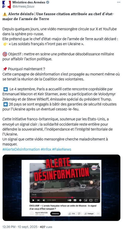 Dans la foulée, le ministère des Armées a également publié un démenti sur son compte X ce jeudi (lien archivé).