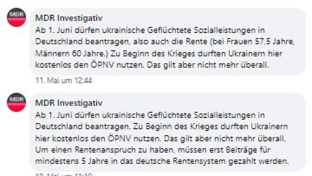 Tatsächlech hat d’Facebook-Säit vun “MDR Investigativ” den 11. Mee fir d’éischt feelerhaft geäntwert: “Ab dem 1. Juni dierfen ukrainesch Flüchtlinge Sozialleeschtungen an Däitschland ufroen, also och d’Pensioun (bei Frae 57,5 Joer, Männer 60 Joer).”